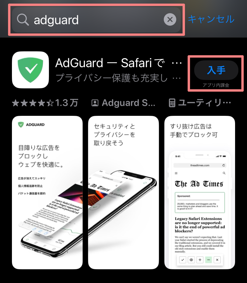 検索から「AdGuard」アプリを探し「入手」をタップします