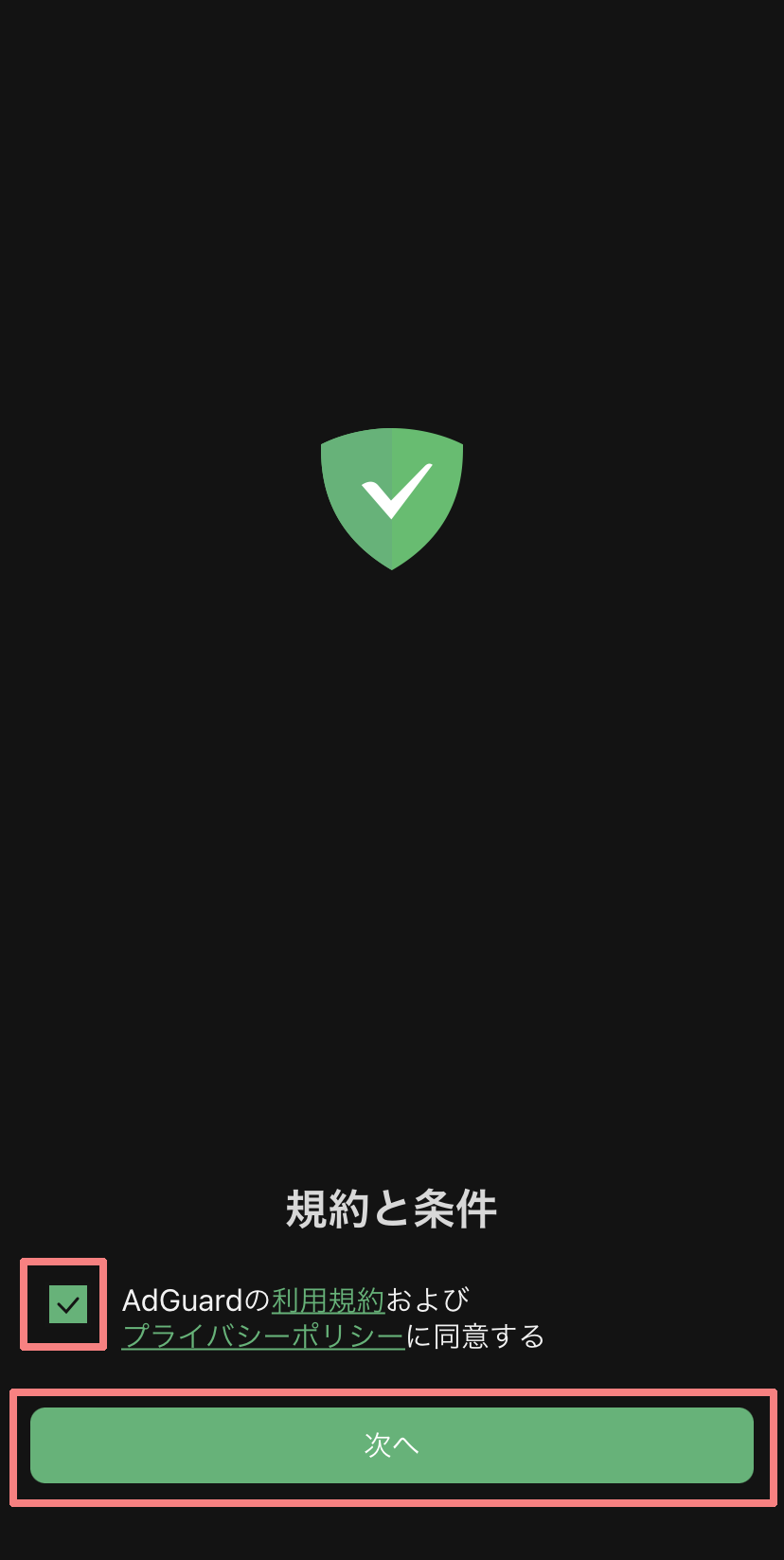 規約と条件を確認し、「同意する」にチェックを入れ「次へ」をタップします