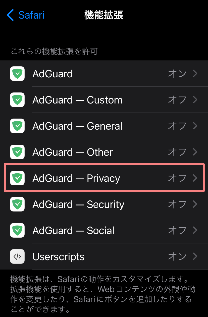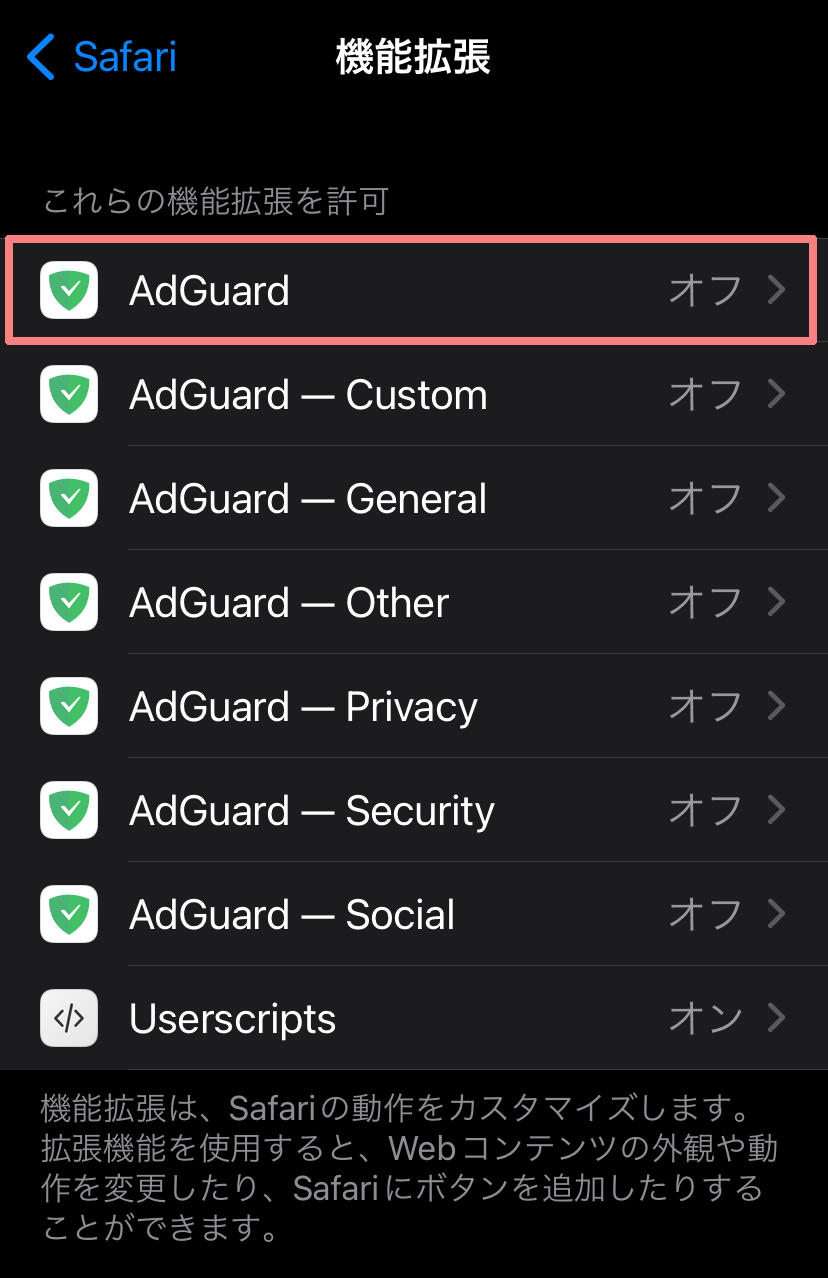 「AdGuard」「AdGuard ~」が追加されていますが現時点では「オフ」のままになっています