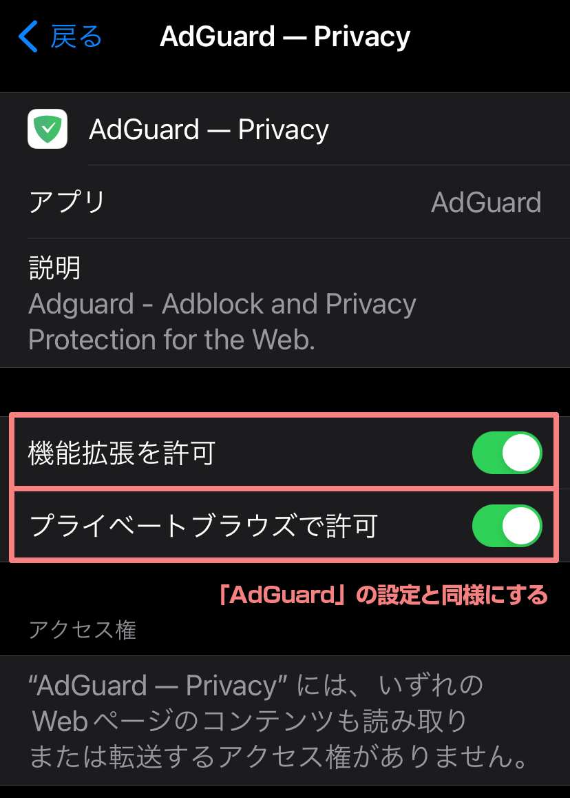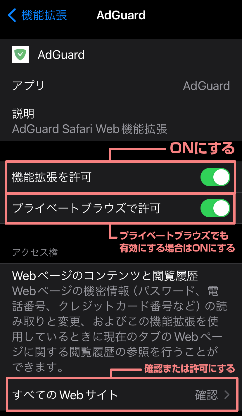 「AdGuard」の時と同じように「拡張機能を許可」「プライベートブラウズで許可」をそれぞれONにします