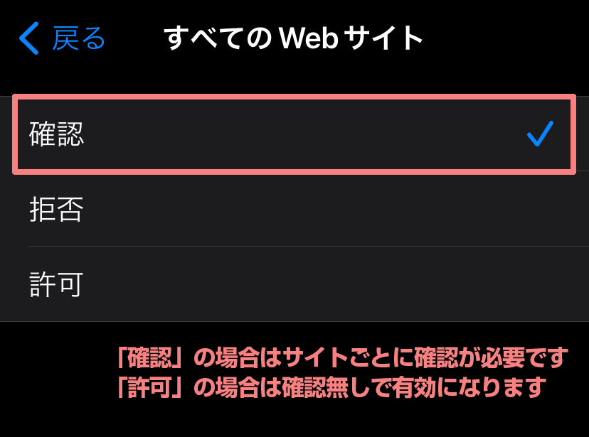 「すべてのWebサイト」が「確認」または「許可」のどちらでもない場合は、タップし選択します