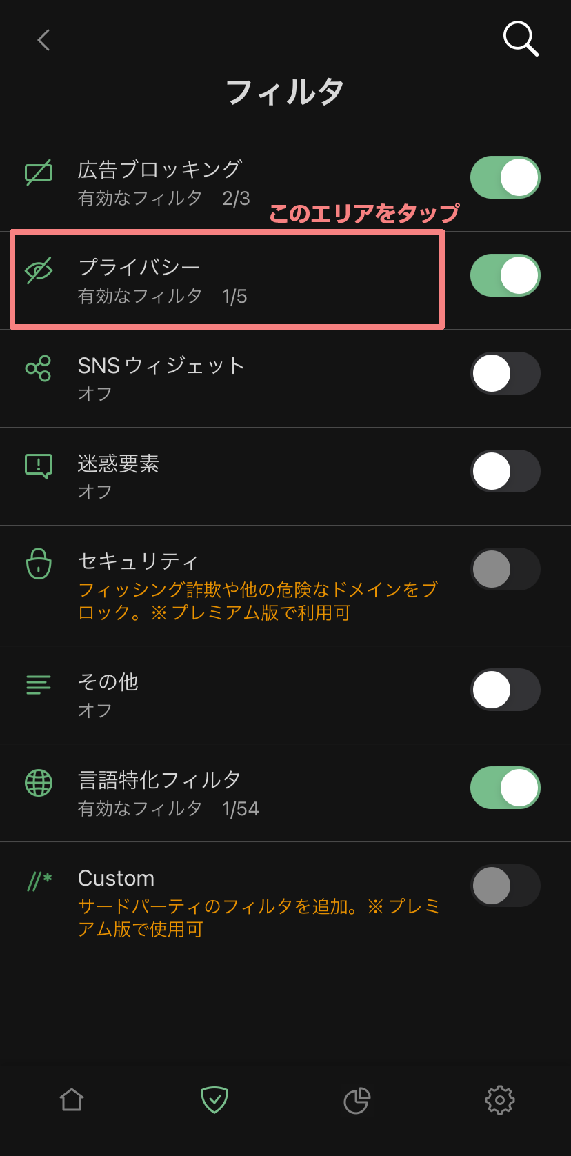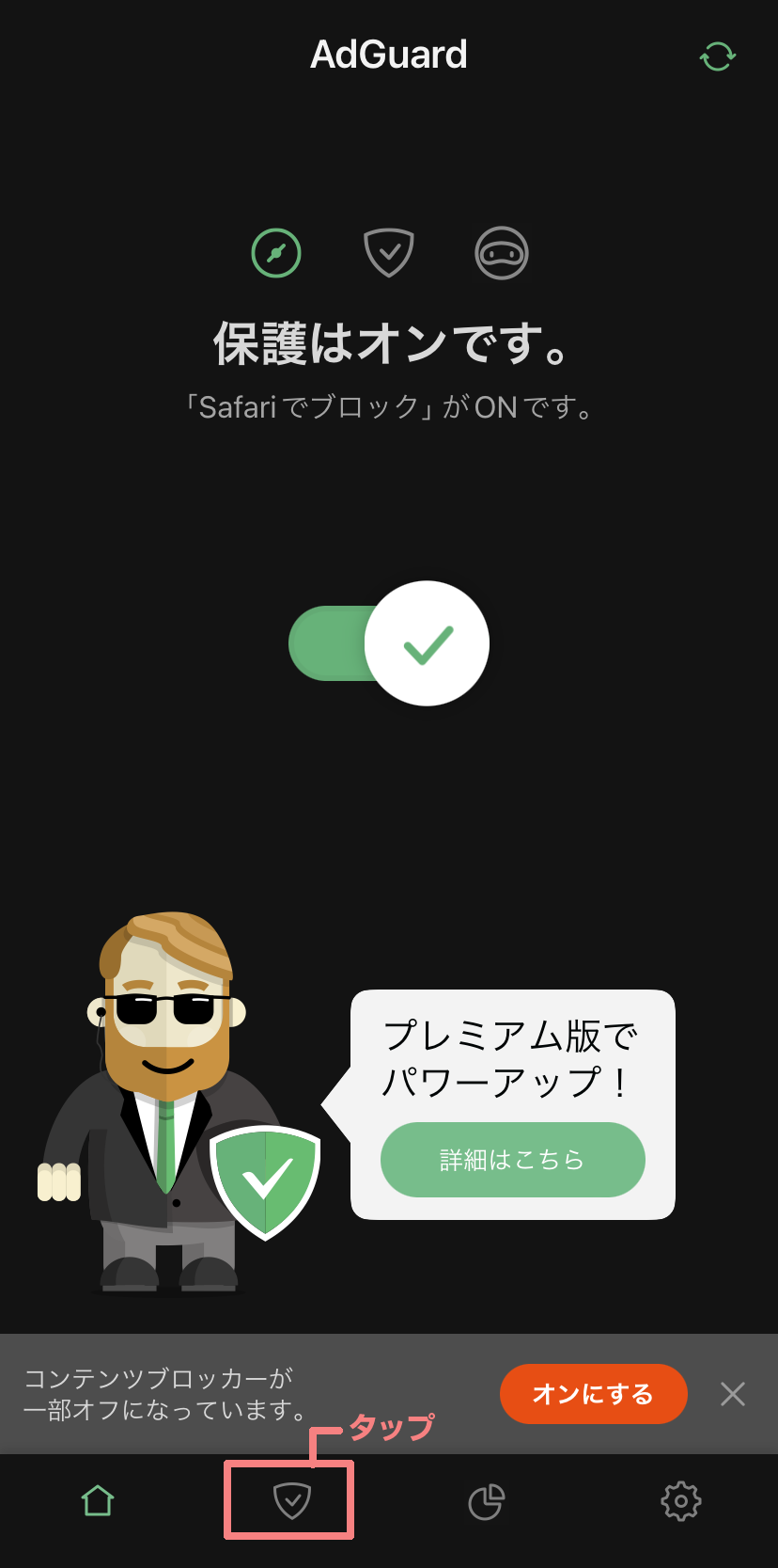 画面下の盾マークアイコンをタップします