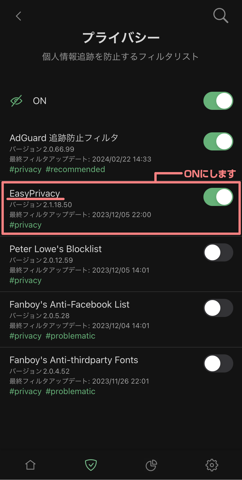 「EasyPrivacy」のボタンをタップし「ON」にします
