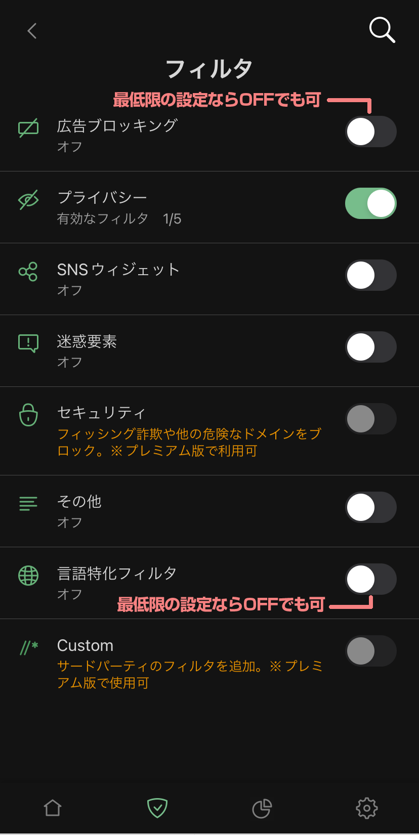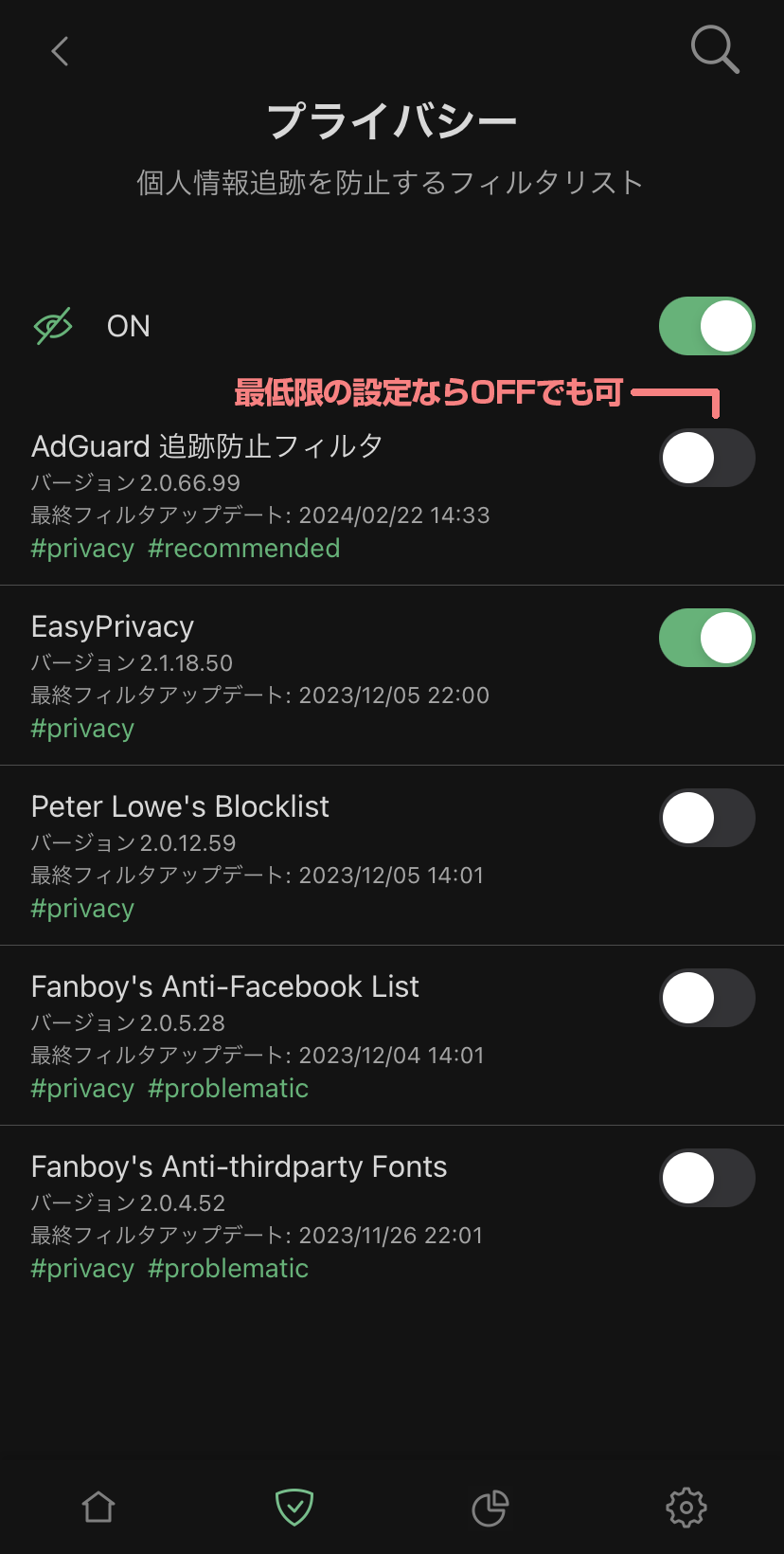 ※その他に項目については個人での広告ブロックの利用に応じて設定してください(本来のアプリの推奨は全て「オン」にします)
