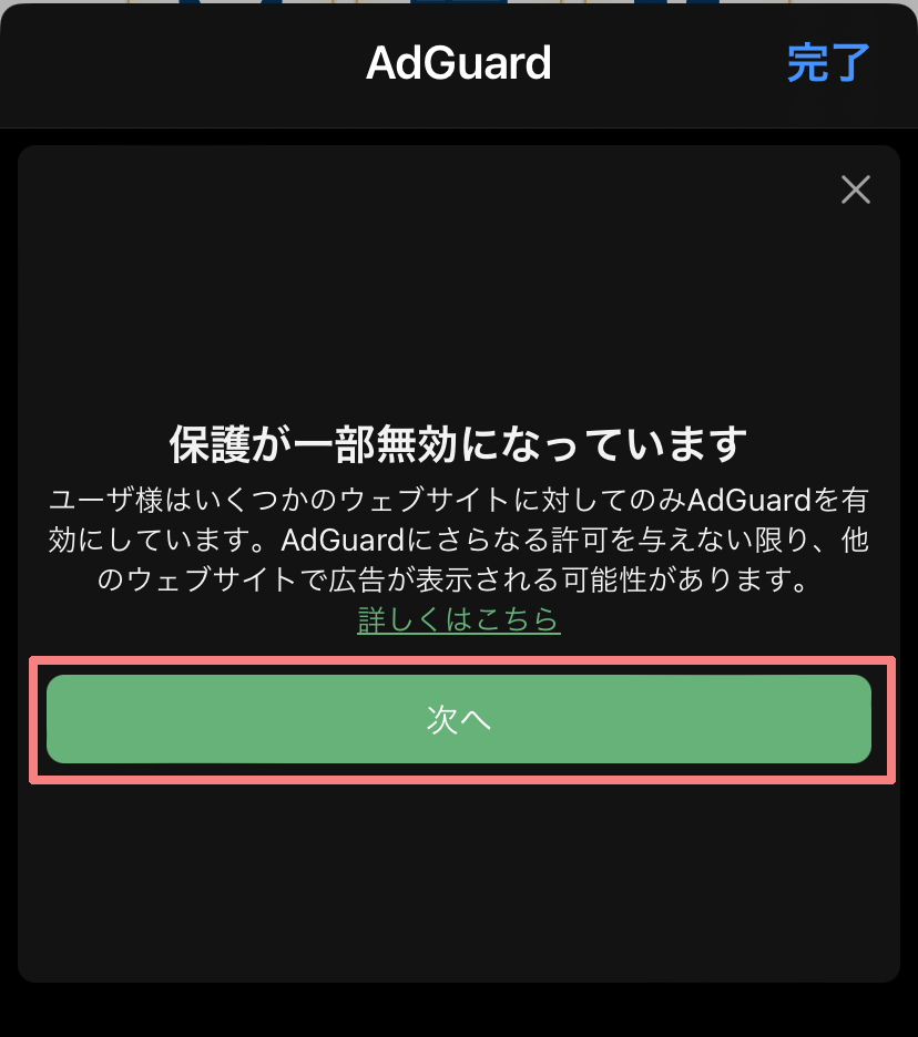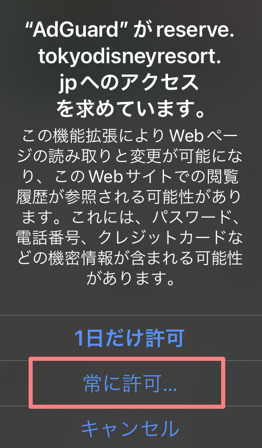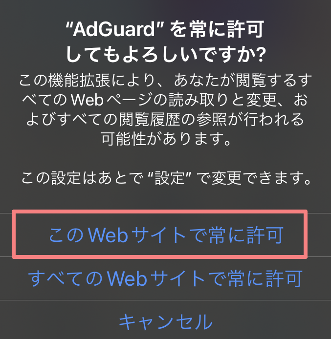 機能拡張設定で「AdGuard」の「すべてのWebサイト」を「許可」とした場合は、この手順は不要です