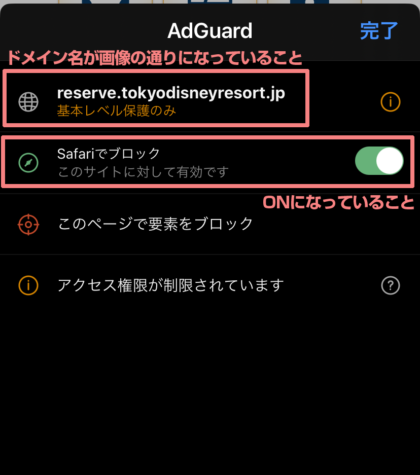 一番上のドメイン名が「reserve.tokyodisneyresort.jp」となっていて、「Safariでブロック」が「ON」になっていることを確認します