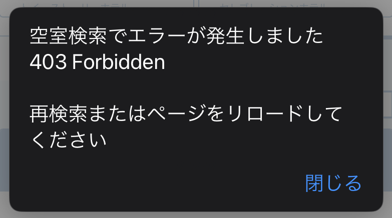 ホテルの「日付・価格から検索」ページ表示時、検索処理でエラーが発生した場合に、読み込み中(グルグル)表示から永遠に変わらなかったり、空室では無いのに全客室タイプが空室表示になる現象があります。(前者はサーバー混雑時に発生しやすいです)